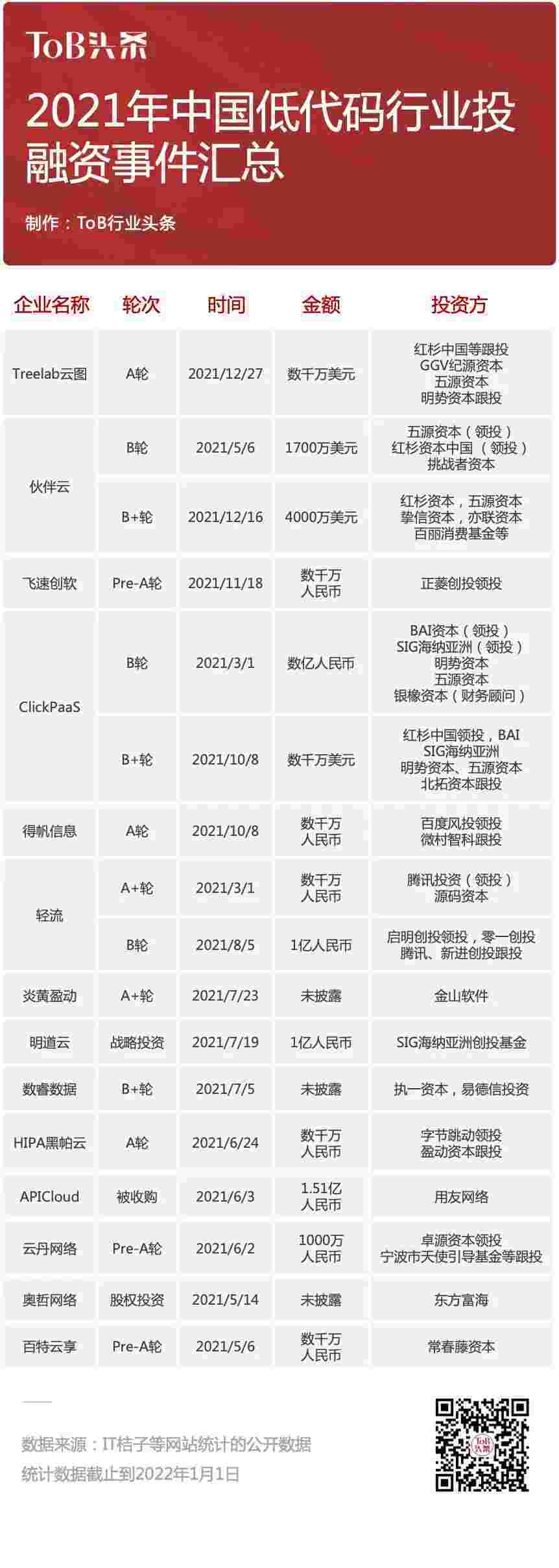 到2021年,,,,无/低代码投融资规模势头更甚,,,,其中包括轻流两轮融资(A+轮数千万人民币,,B轮近亿人民币)、、、、小米钱包 两轮融资(B轮数亿人民币,,,,B+轮数千万美元)、、百特云享数千万元Pre-A轮融资......
